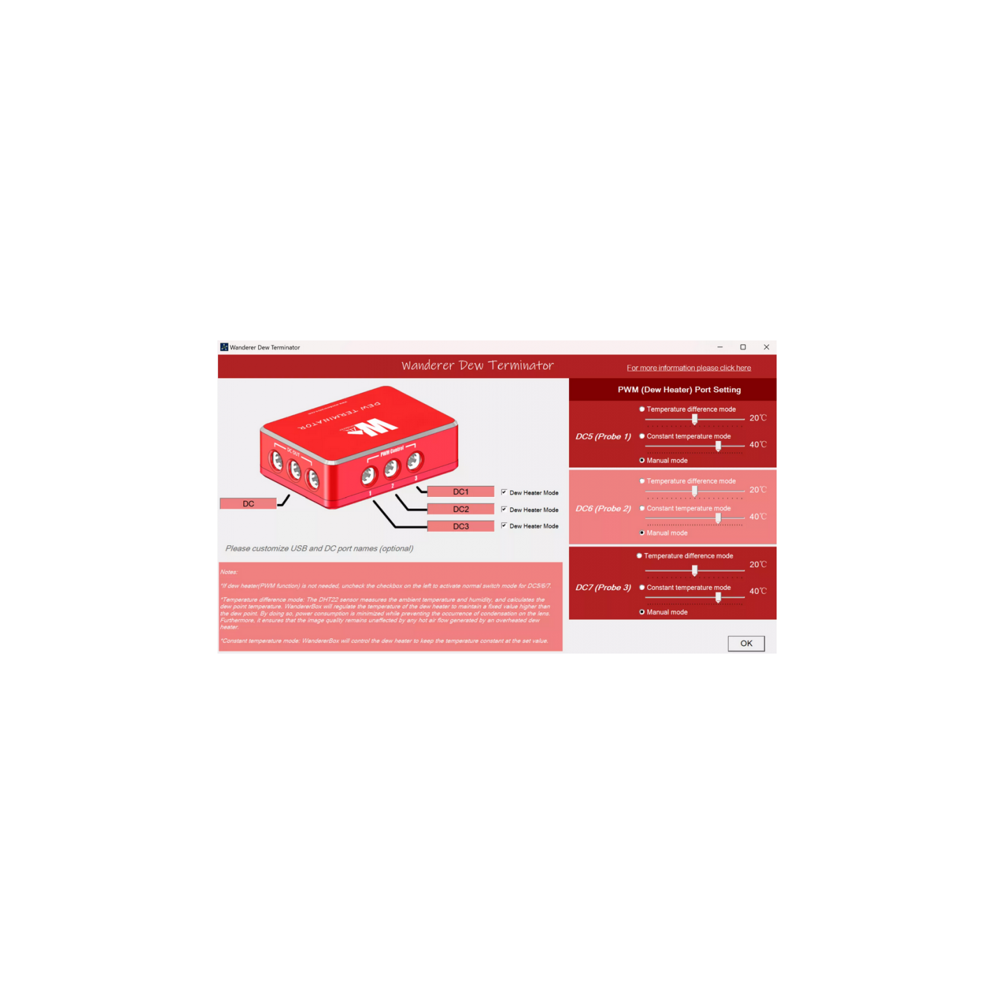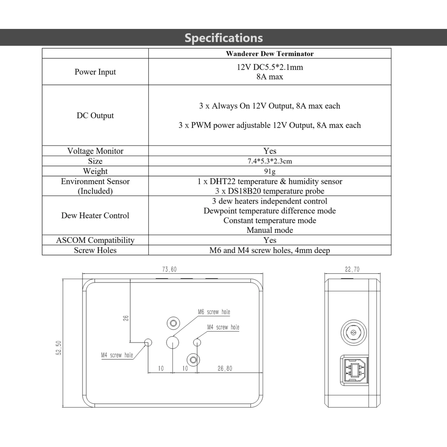 The Wanderer Dew Terminator is a compact and highly advanced intelligent spray heater controller designed for astrophotographers who demand precise, automated humidity and temperature management. With independent control for three spray channels, real-time monitoring and ASCOM compatibility, it offers complete environmental regulation in a small, rugged unit.