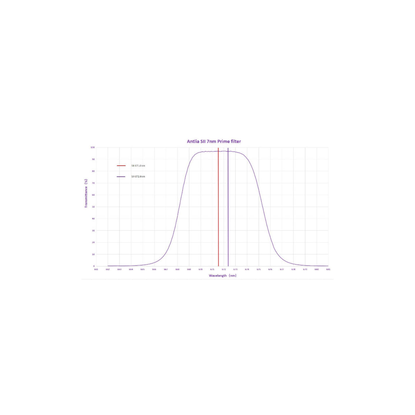Antlia PRIME narrow band filters are designed to bring out the faintest details of nebulae by suppressing unwanted wavelengths from the sky background. The narrower the bandwidth, the more effective the filter. The transmission of the filter is at least 90%. The optical density outside the transmission area is OD4 (0.01%), which provides an excellent signal-to-noise ratio and a clear cut-off of the other lines. The clear cut-off of the signal outside the transmission zone is an important parameter because it determines the quality of the filtration. The steeper the cut-off slope, the greater the contrast between the signal from the nebula in question and the background sky, which has become perfectly black. In addition, a sharp cut-off minimizes halos around bright stars.