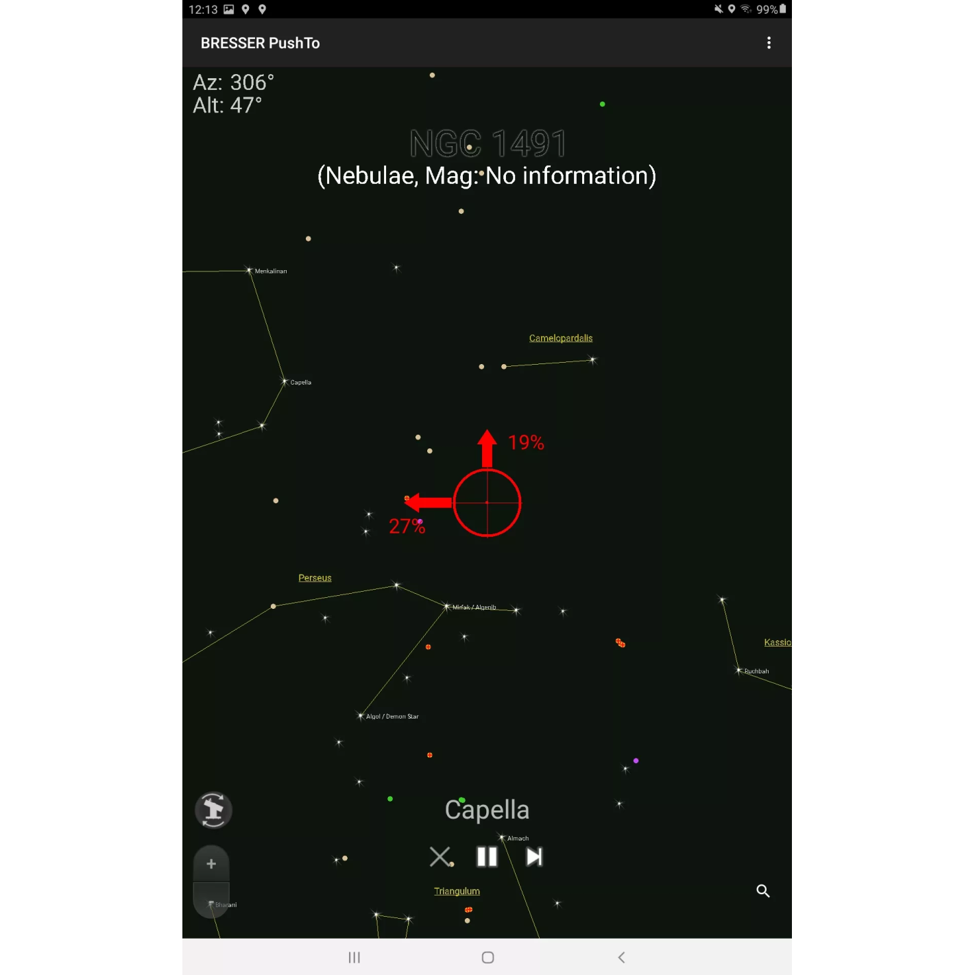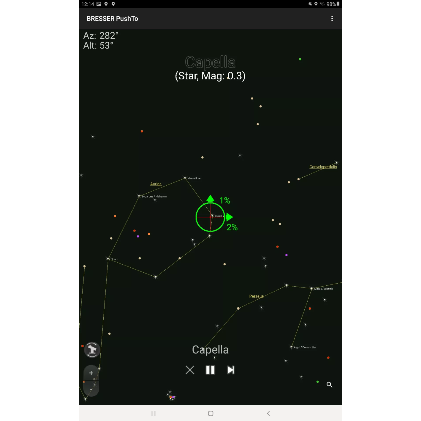 The telescope is very easy to use and can be set up without much effort. The first steps consist of simply downloading the smart navigation app PushTo from BRESSER and performing a short initialization of the telescope. From there, you will see the current direction directly on the star map on your device. This is made possible by the integrated sensors in the telescope and the Bluetooth connection to your device. Thanks to the built-in sliding clutches on both axes, you can easily move and adjust the telescope manually.