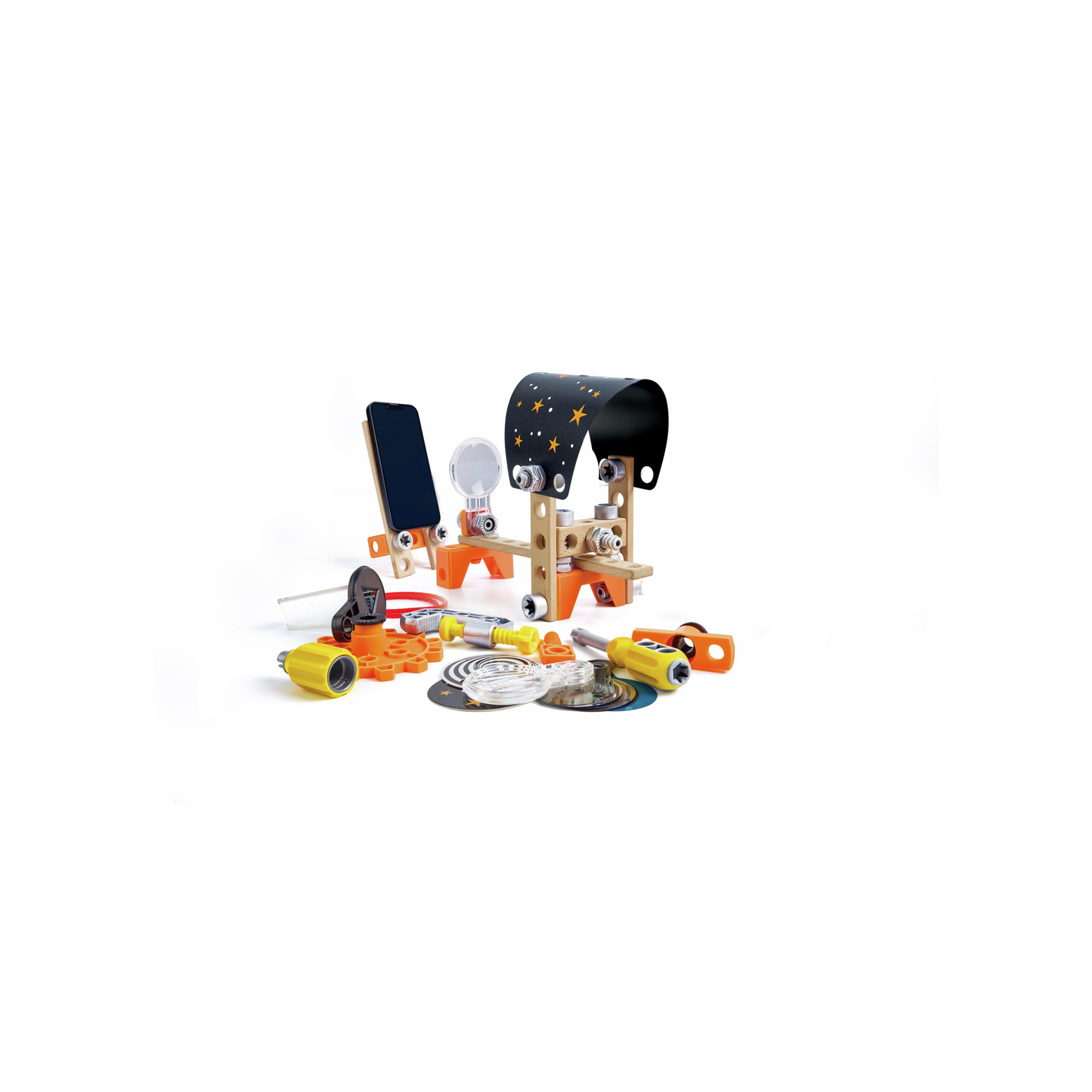 Includes instructions, tools and all the parts you need to create eight optical experiments including a periscope, a cone illusion, a 3D viewer, a rotating kaleidoscope, an infinity mirror, an optical lab, an optical illusion pendulum and a camera obscura.