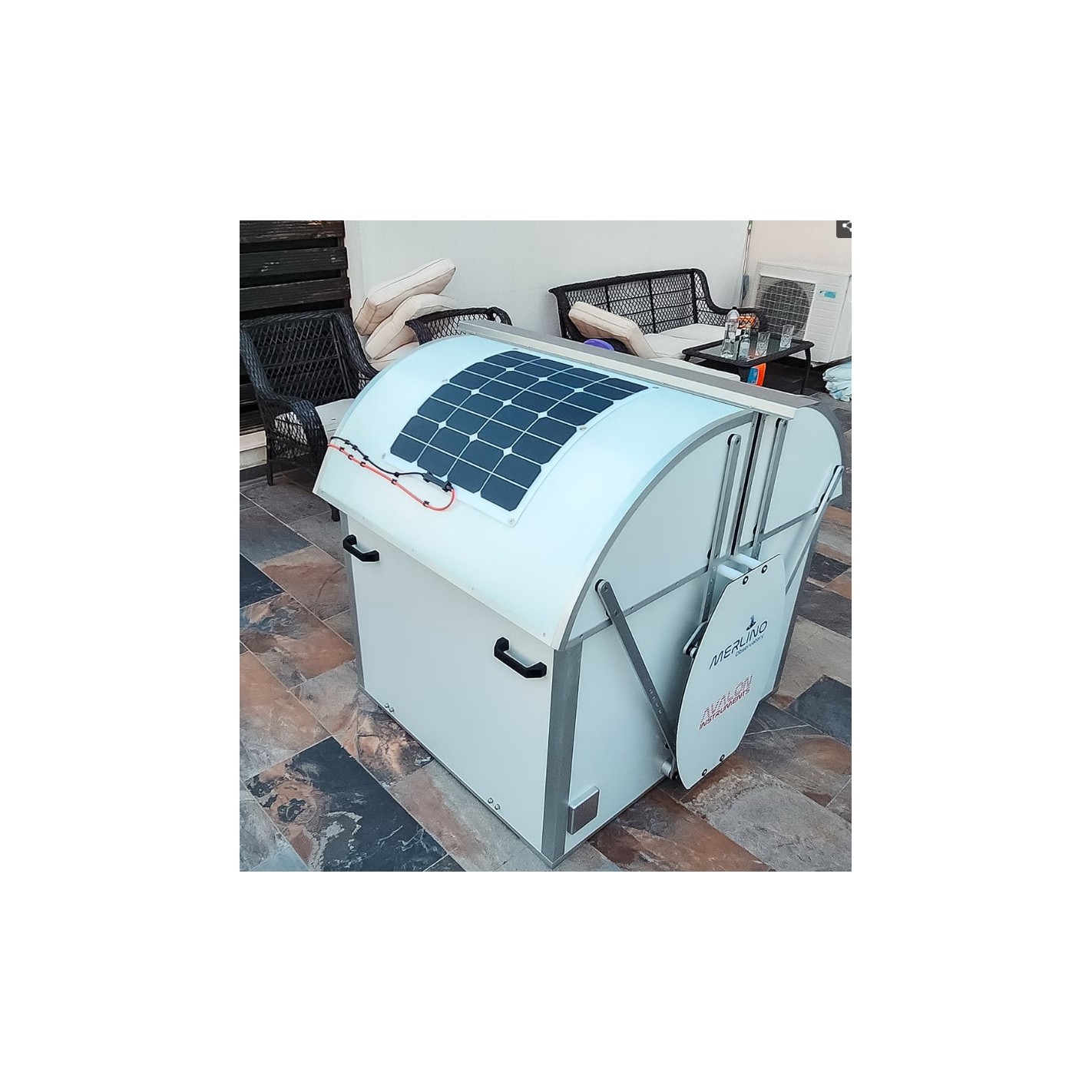 Of course, the Internet connection allows you to use the Merlino from a remote location. The Merlino runs entirely on 12 volt power, a sealed AGM battery in the range of 100 to 150 Ah (battery not included in the package) and solar panelsare recommended , allowing you to quickly log off and automatically recover in case of power outage.