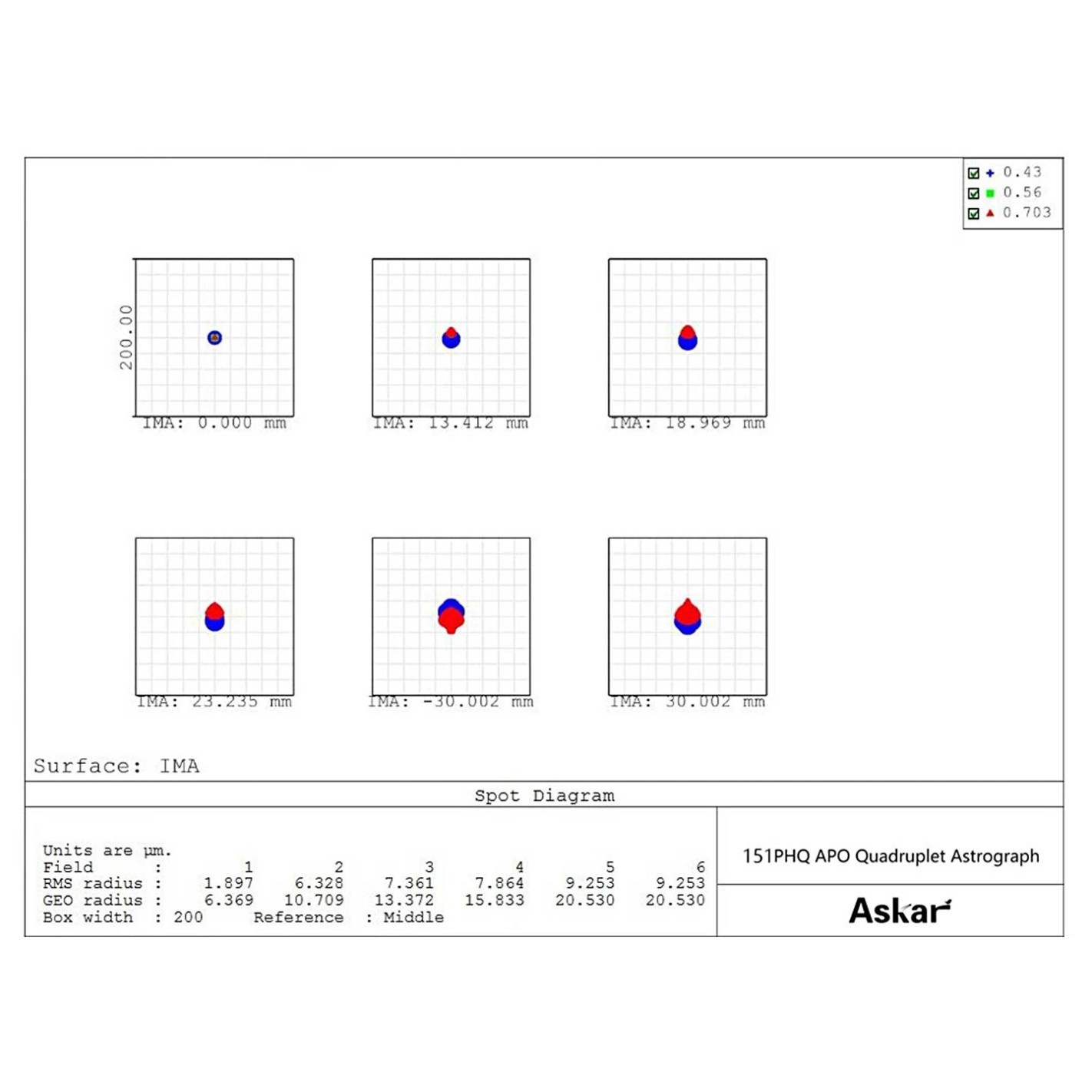 The 151PHQ has a 21 mm larger aperture than the 130PHQ. The triplet lens with two ED lenses offers excellent control of chromatic and other aberrations. With its self-planing design, due to the fourth optical element, the 151PHQ offers great advantages in astronomical photography. It supports a medium mount (e.g. ASI461MM Pro) 60 mm image circle, has a fine dot pattern with minuscule distortion of the peripheral stars, and its central RMS radius is less than 2 microns.