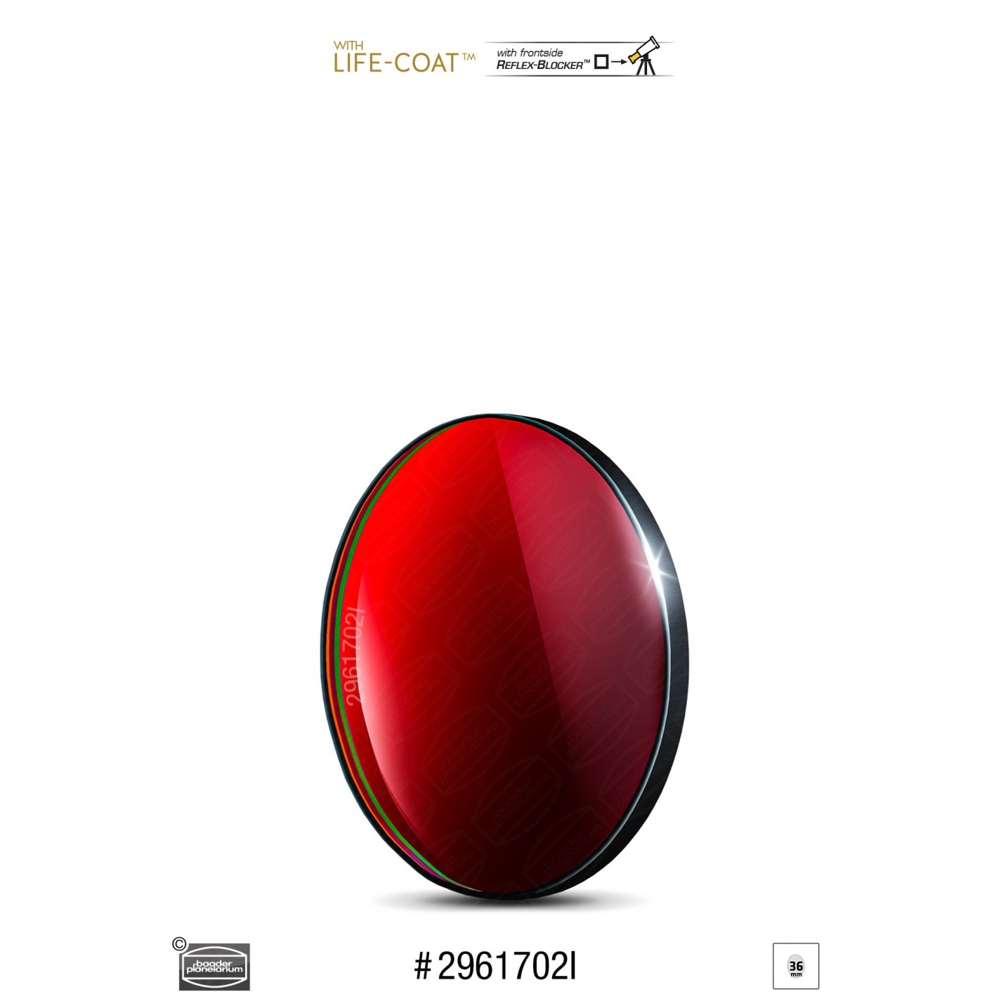 - 36 mm x 2 mm Baader Sloan-i' bandpass filter, suitable from f/15 to f/1.8