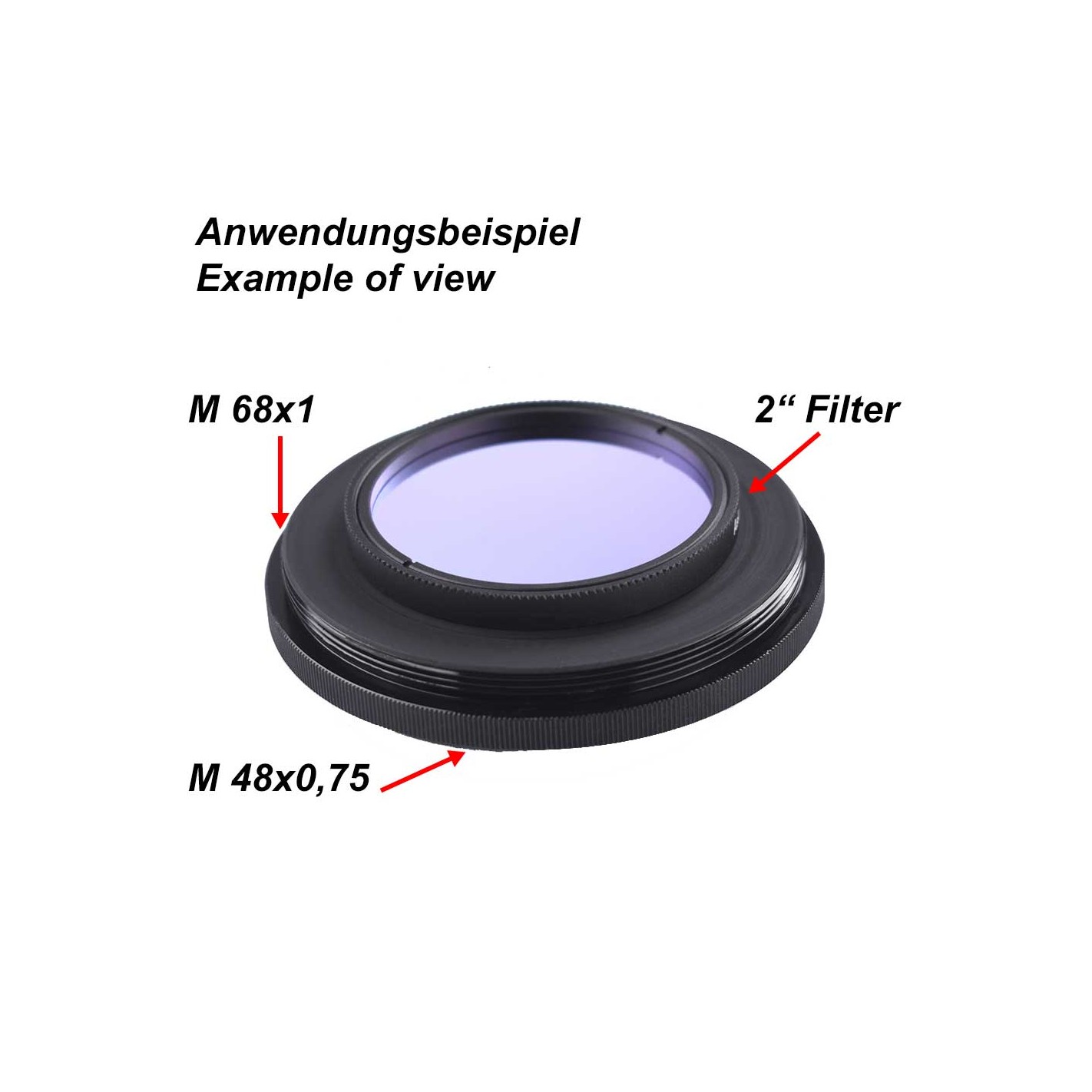 - Camera adapter with M68x1 male thread on the corrector side and M48x0.75 male thread on the camera side and connection for 2" filter (length 5 mm)