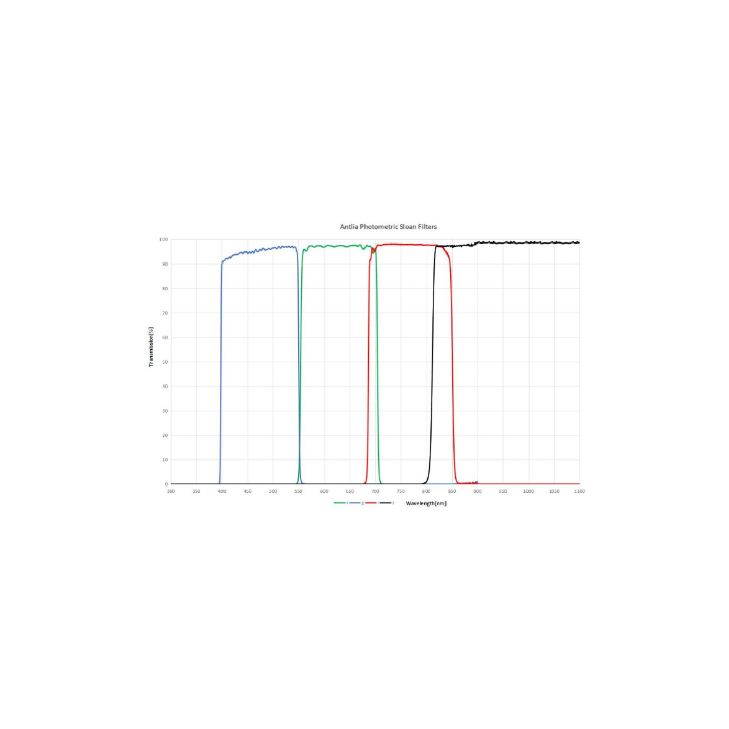 The SLOAN Antlia filters comprise 4 filters (g'/r'/i'/z') covering the visible spectrum and beyond: from 400nm to the sensitivity limit of silicon CCD cameras (about 1100nm). The technology used (ion gun assisted deposition on the substrate polished on both sides) makes Antlia filters references in terms of durability and performance.