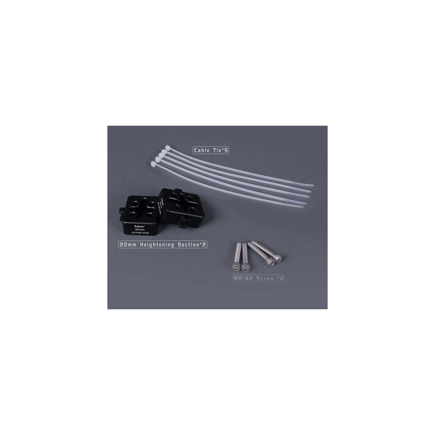 The kit includes two 20 mm riser blocks, four 40 mm M6 screws for installation and five cable management flanges, which can be attached to either side of the blocks for neat and efficient cable routing.