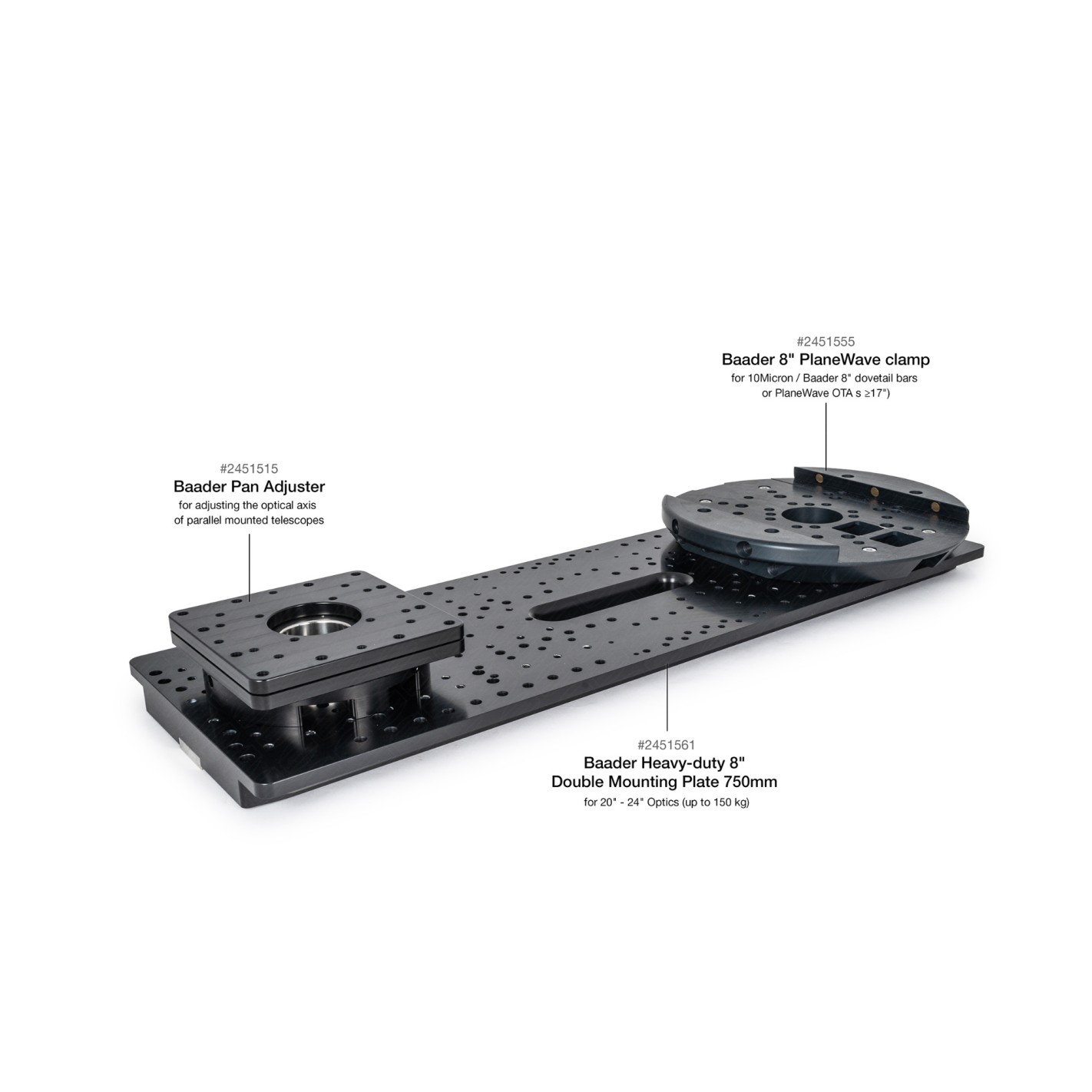When ordering, it is important to indicate the mount on which it will be used to determine the appropriate type of hardware. Baader supplies the clamp without screws, as each mount requires a specific set. This ensures correct and secure integration into equipment such as 10Micron, PlaneWave L-Mount, Paramount, Astro-Physics and other high-performance platforms.