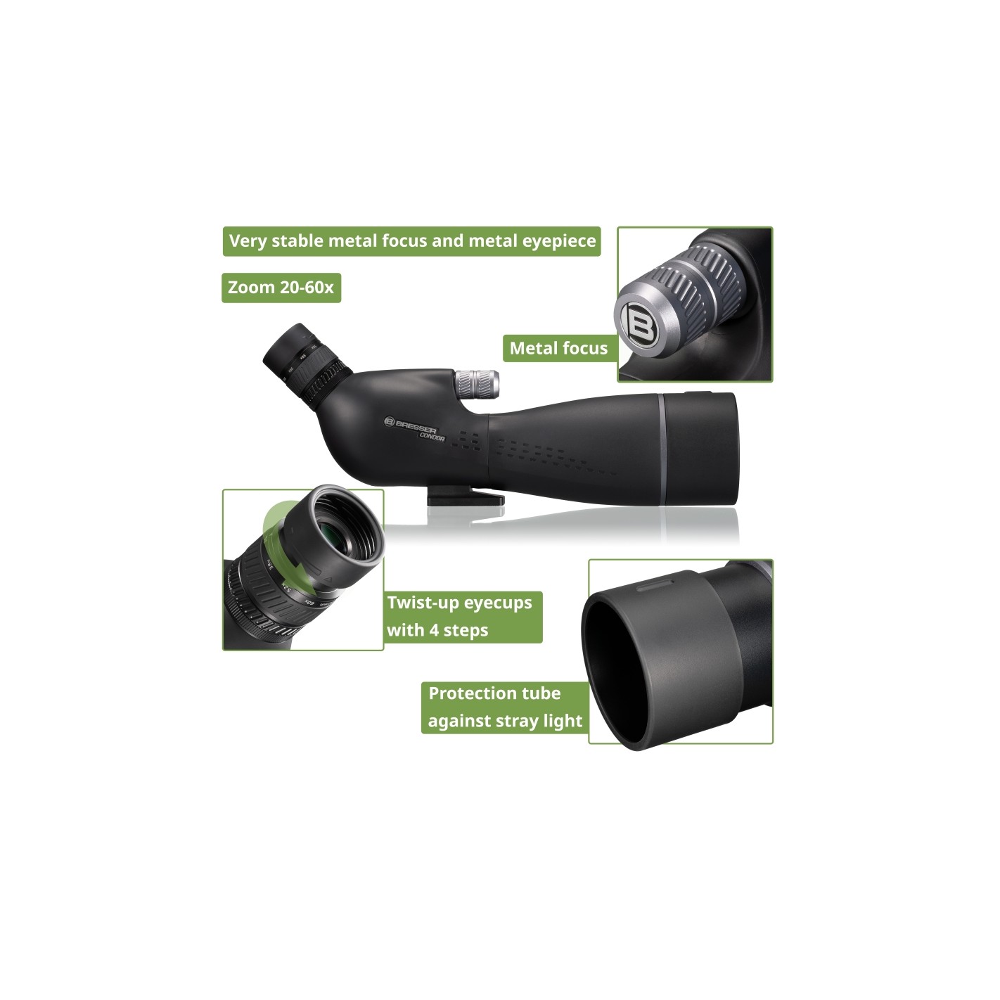 TheBRESSER Condor spotting scopesHave been designed primarily fornature and bird watchers. Thanks to thelarge opening of 80 mm,this device is ideal for observation in low light conditions. It collects a44 % more lightthan a device with the same magnification and an aperture of 60 mm. The BRESSER Condor ground telescope is equipped with afull multi-layer broadband coatingfor brilliant images. Together with thewatertight housingAnd the anti-reflective outer reinforcement, in all weather conditions animal and nature observers can, for example, determine the types of birds and observe wild animals even at a great distance.