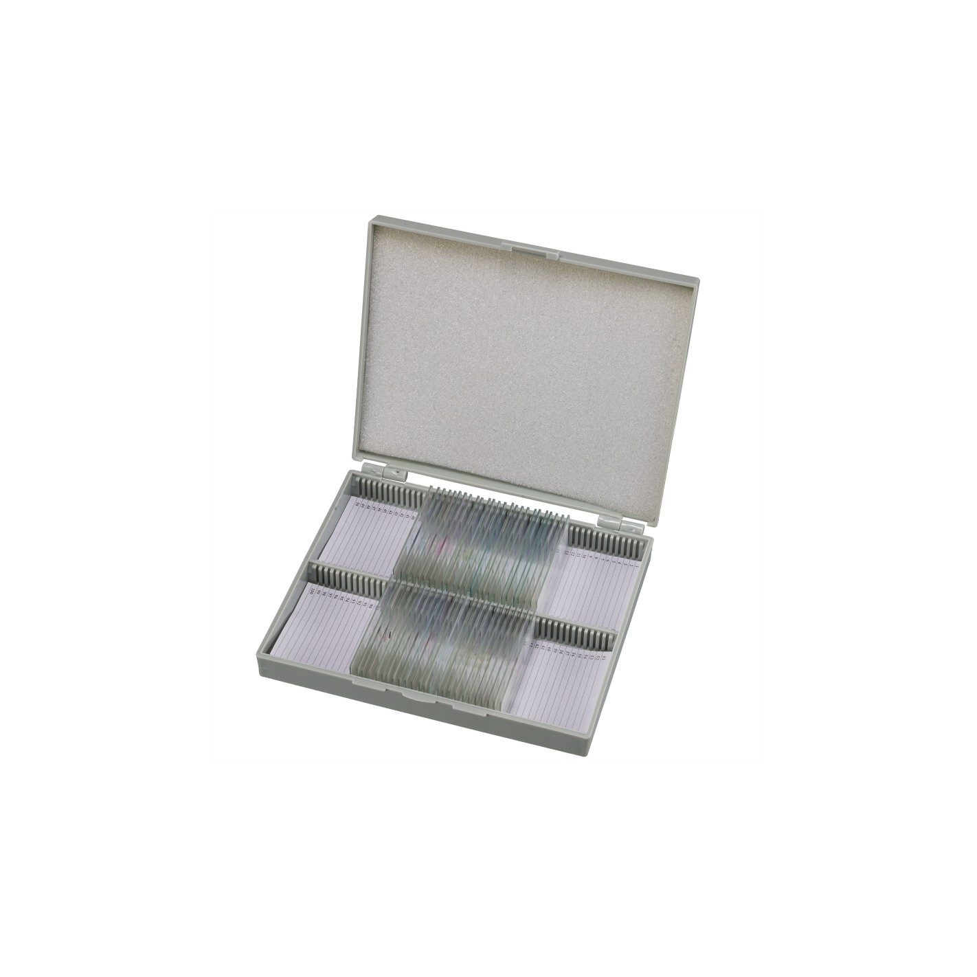 - 30 prepared Histology specimens in a wooden box for microscopy.