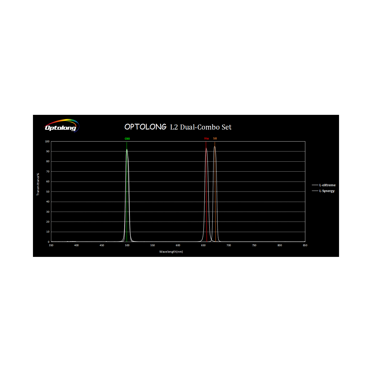 Based on the characteristics of the celestial emission lines and light pollution emission lines, the L2 Dual-Combo Set preserves the distinctive colors of nebulae in OIII, Hα and SII while filtering out the vast majority of light pollution. Specifically designed and optically optimized, its transmission profile is as follows: