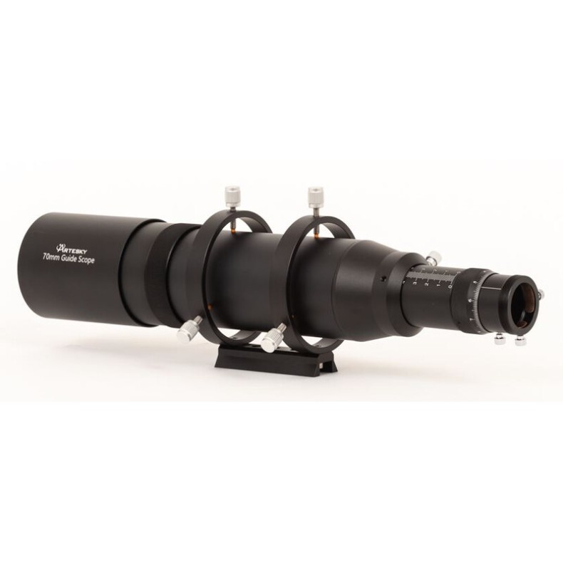 The guide scope is equipped with guide telescope clamps with nylon tips, which allow it to be sensitively aligned to a guide star. The rail fits into a finder shoe as commonly used by Vixen, GSO, Orion, Skywatcher or Celestron.