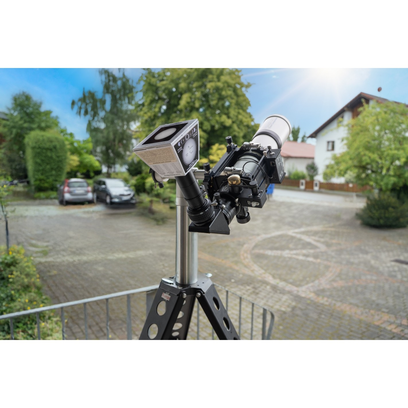A telescope suitable for solar projection with a stellar diagonal/prism - ideally a refractor with a focal length of 250-1200 mm. The projection screen has been tested on telescopes with f/5 (90/500) and f/4 (VarioFinder 61/250), as well as 150/1200 mm and 150/2250 mm refractors, each for several hours at full aperture. To reduce thermal stress on the star diagonal, we recommend using telescopes faster than f/6 and, if necessary, reducing the aperture of telescopes with larger diameters to about 80 mm. You can see the entire Sun in telescopes up to about 1200 mm focal length; larger telescopes produce higher magnification and show only part of it. A variable eyepiece projection adapter with T-2 thread. The Solar Projection Screen was developed for the Baader OPFA. The diameter of the solar image depends on the distance to the projection surface. The Eyepiece Projection Adapter OPFA I - with 1¼" eyepiece holder (#2458141, € 63,-) has a 1¼" connection;The Eyepiece Projection Adapter OPFA II - with 2" eyepiece holder (#2458142, € 80,-) fits star diagonals/prisms with a 2" eyepiece holder. If you use a Baader diagonal/prism with T-2 connection, you can screw the OPFA IV Eyepiece Projection Adapter - Basic Version with T-2i (#2458144, 55 €) directly into the housing and thus save focal length posterior.Tambi. You can also use other projection adapters, but this may result in different image sizes. The solar image should be at least 60 mm in diameter.