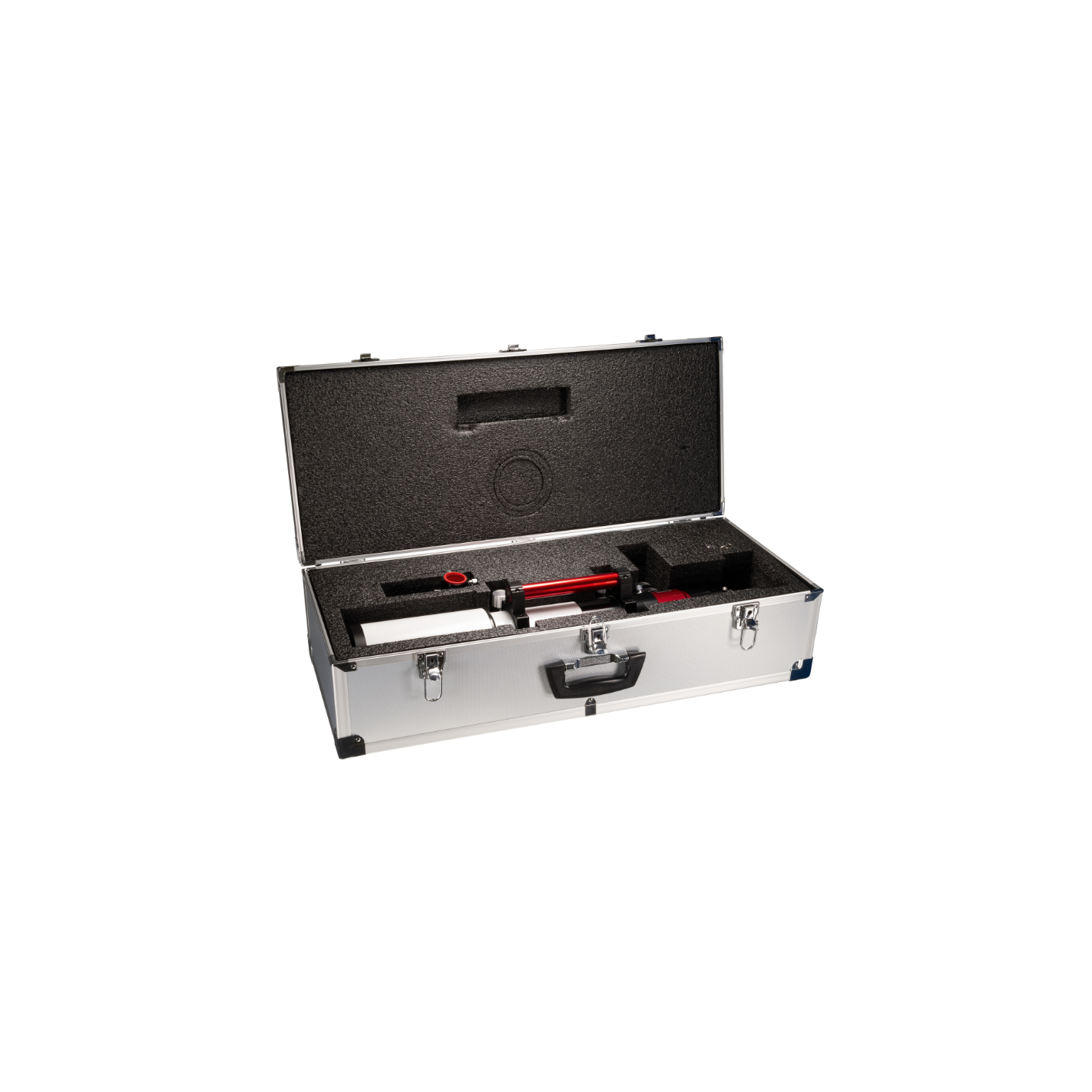 The LS100MT/B3400 is a complete telescope for sun observing in H-Alpha light, with a 100 mm free aperture (no central obstruction) and a focal length of 714 mm. The H-Alpha wavelength is the most impressive way to observe the sun, showing bumps on the edge of the sun, filaments and flares on the surface, and much more. An internal etalon filter achieves with the innovative Pressure-Tuner air pressure adjustment system a bandwidth of less than 0.7 Angström. The adjustment is made by a slight change in air pressure inside a pressure chamber inside the telescope. This changes the refractive index of the air, allowing a precise adjustment to the H-Alpha line. The Pressure-Tuner ensures a uniform image, without central obstruction, and durably protects the etalon without wear. A set of collimating lenses installed in the telescope ensures optimum performance.
