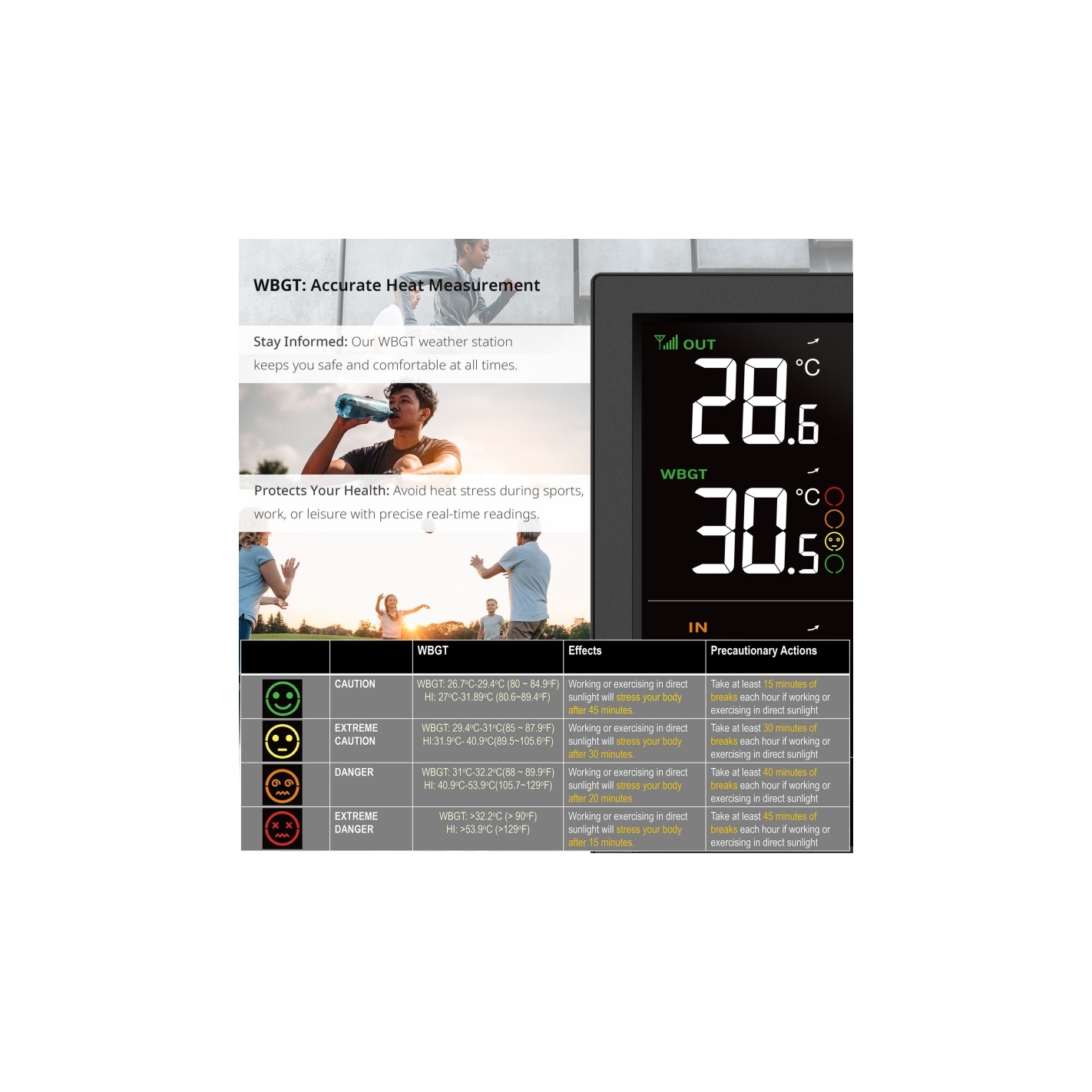 When the sun beats down in summer, the WBGT (Wet Bulb Globe Temperature) value with heat stress index will be your best guide for outdoor activities. Thanks to the 4 warning levels, you can quickly identify what to look out for according to the current weather conditions. Perfect for sportsmen, gardeners, etc.