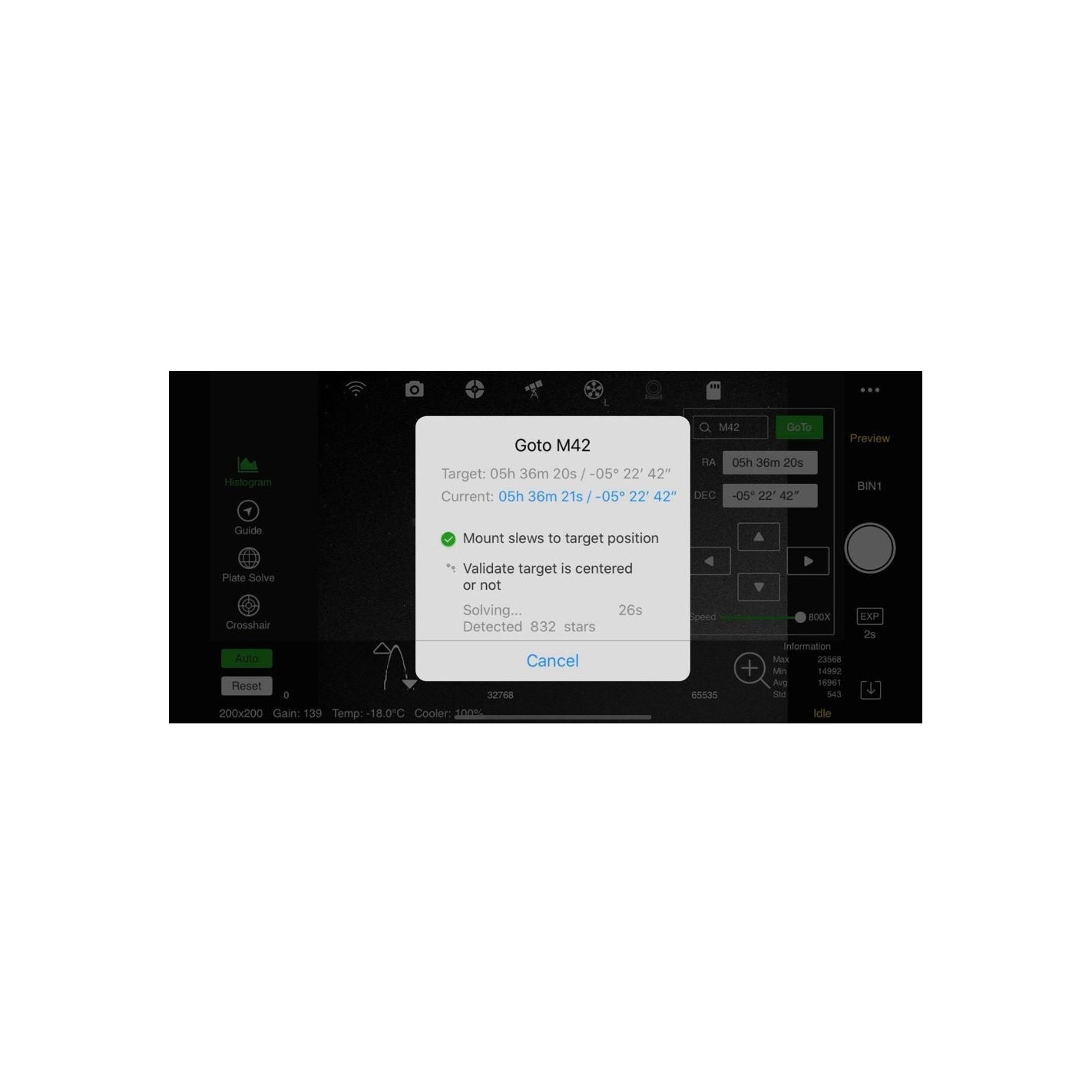 Precise focus:After performing a rough focus, select a star, then a precise focus can be performed through curves such as brightness and HFD.It can also be done with ZWO EAF by remote control.Pole alignment:Based on the powerful plate resolution function, it can complete the polar axis alignment in arc seconds in minutes.Accurate GoTo:With a rich database of celestial objects, an accurate GoTo can be achieved after object selection.Stable guide:Independent and stable guidance control can be achieved without the PC.Preview mode:You can see the image of the object just below 'Preview'.automatic execution: